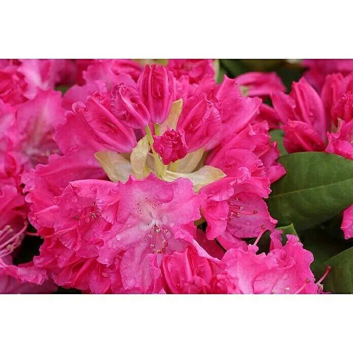 Wenn der Rhododendron-Hybride ‚Germania’® ab Mitte Mai in Blüte steht, zeigt er sich in schönstem Rosarot. Auch außerhalb der Blütezeit ist er ein ansehnliches, immergrünes Gehölz mit dunkelgrünem, lanzettlichem, glänzendem Laub. Der Wuchs gestaltet sich buschig, breit und rundlich, sodass Rhododendron ‚Germania’® Größen von bis zu 2,5 m Höhe und 2,5 m Breite erreichen kann. Ideal für ein gesundes Wachstum ist ein halbschattiger bis schattiger Standort mit humosem und kalkfreiem Boden.