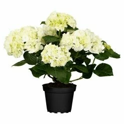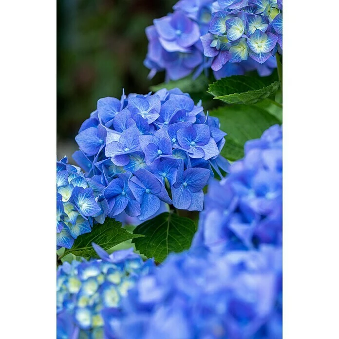 Die Bauernhortensie trägt ein sommergrünes Laubkleid aus mittelgrünen, eiförmigen, gesägten Blättern. Ab Juni zeigt sie viele blaue, rosafarbene, rote oder weiße Blüten. Der Wuchs gestaltet sich buschig und aufrecht, sodass Hydrangea macrophylla Größen von bis zu 1,5 m Höhe und 1,5 m Breite erreichen kann. Ideal für ein gesundes Wachstum ist ein halbschattiger bis schattiger Standort mit humosem, leicht saurem Boden.