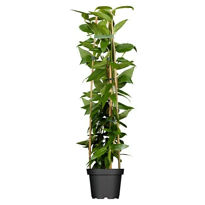 Die Immergrüne Geißschlinge (Lonicera henryi) ist eine rankende Gartenpflanze mit dekorativen, schwarzen, runden Früchten. Die gelb-roten, röhrenförmigen Blüten mit einem angenehm duftenden Duft erscheinen von Juni bis Juli. Im Frühling kann ein Langzeitdünger verwendet werden. Dieser gibt die Nährstoffe langsam und kontinuierlich ab, so dass die Pflanze über einen längeren Zeitraum gleichmäßig versorgt ist. Netze, Stäbe oder Gitter – viele Materialien eignen sich als Rankhilfen für zierliche Kletterpflanzen. Wichtig ist jedoch, dass die Haupttriebe der Pflanzen sicher angebunden werden. Containerpflanzen können, außer bei gefrorenem Boden und bei Sommerhitze (über 30°C ), ganzjährig gepflanzt werden.